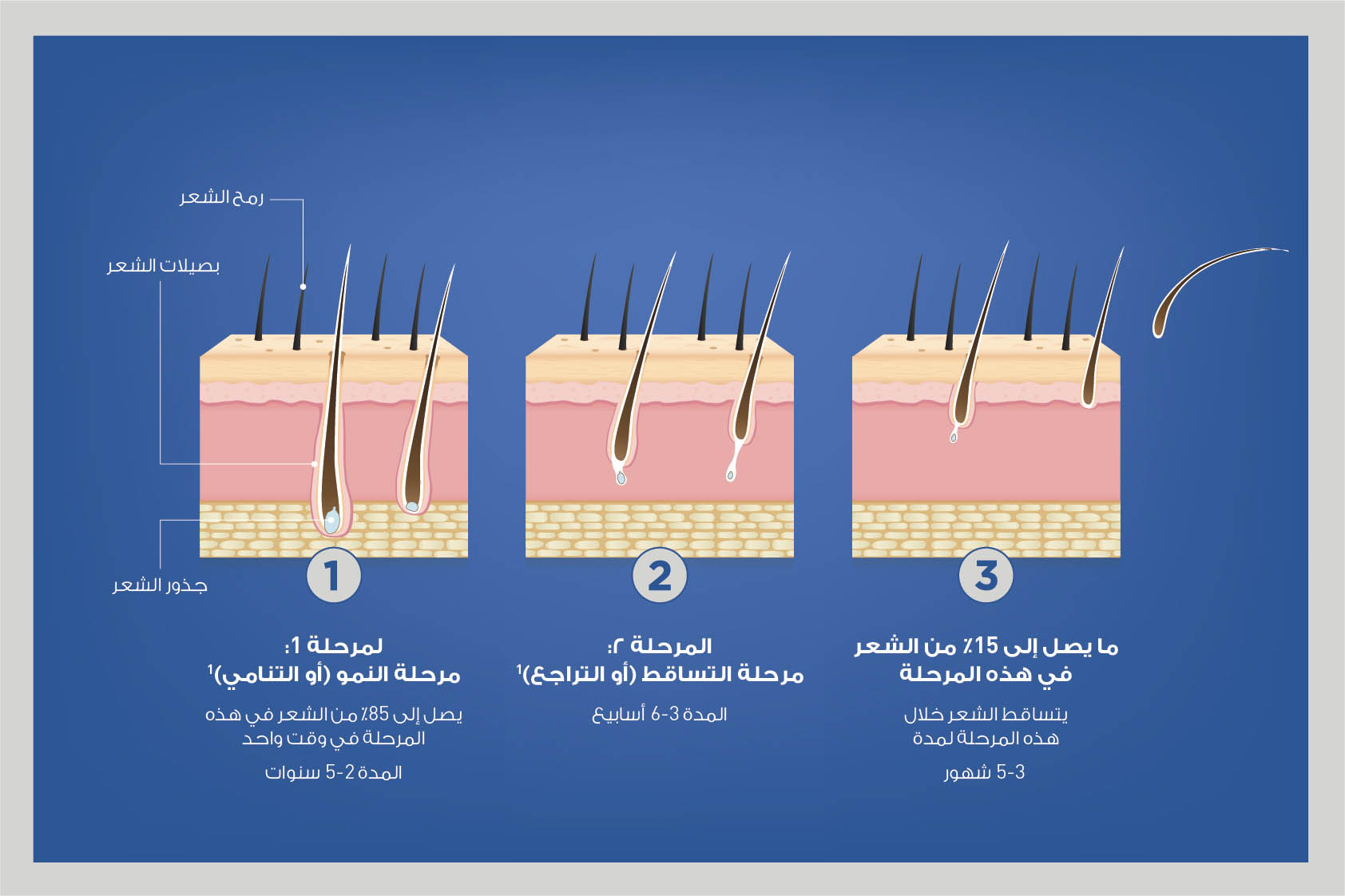 تتكون دورة نمو الشعر من ثلاث مراحل: مرحلة النمو والتساقط والراحة.١٣ وفيما يلي المزيد من المعلومات حول ما يحدث في كل مرحلة من مراحل دورة نمو الشعر.
